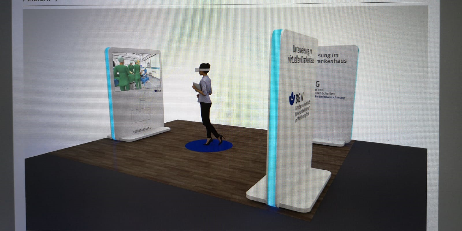 Virtual Reality ist ein neues Medium, welches u.a. dazu dienen kann, sich intensiv mit einer Materie auseinander zu setzen. Von daher lag es nahe, dass die Berufsgenossenschaft BGW im Rahmen eines Modellvorhabens prüft, ob VR gezielt zur Verbesserung der Situation am Arbeitsplatz einzusetzen ist. Gewählt wurde schließlich ein Ansatz des „sicheren Krankenhauses“: Junge Pflegerinnen und Pfleger sollen hier im Rahmen ihrer Erstunterweisung an ihrem Arbeitsplatz potenzielle Gefährdungssituationen bewältigen sollen. Aber selbstverständlich sind auch verwandte Aufgabenstellungen in Industrie und Dienstleistungen realisierbar.